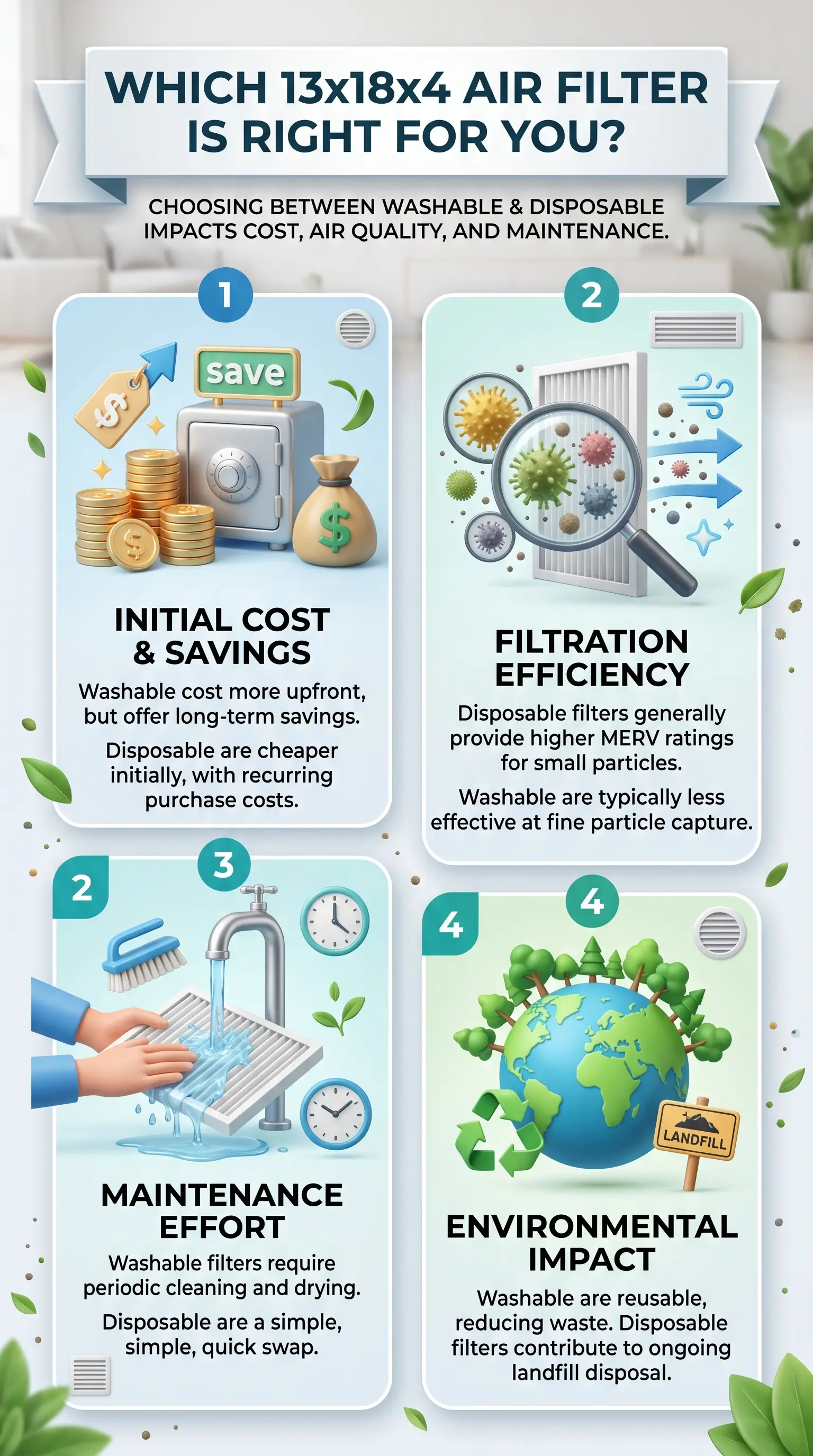Pick a disposable if anyone in the house has allergies. An allergen defense pleats model is a solid baseline. With pets in the home, an odor eliminator filter handles dander and household odor at the same time. If you run a UV light in your HVAC, read up on the UV system tradeoffs before you commit. And if you live somewhere humid like South Florida, the mold risk alone makes a disposable the safer call. A washable makes sense when you prioritize lowest long-term cost, nobody in the home has sensitivities, and you'll actually clean it every 30 days. For most families, a high-quality MERV 11 disposable is the call. You can shop premium 13x18x4 air filters online in the exact size and MERV your system needs.